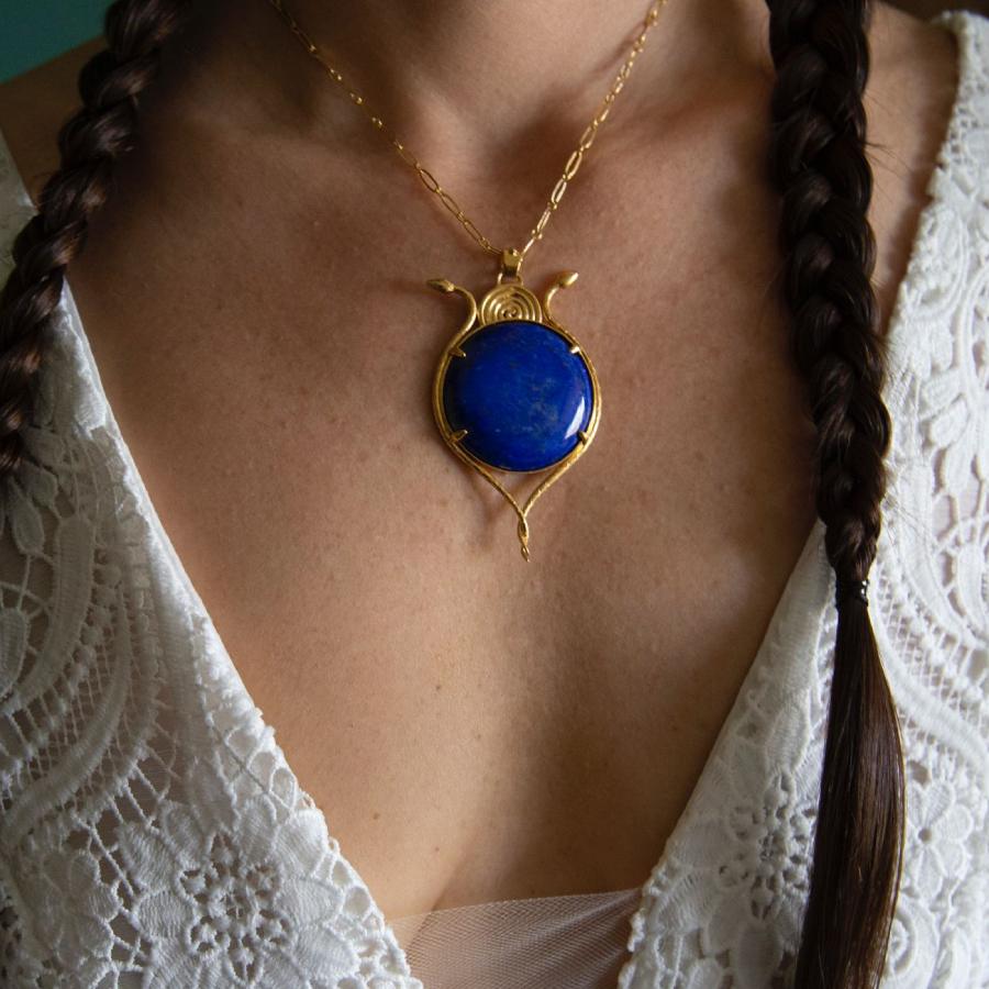 Natalia, 24K gold plated snake and lapis lazuli pendant statement necklace