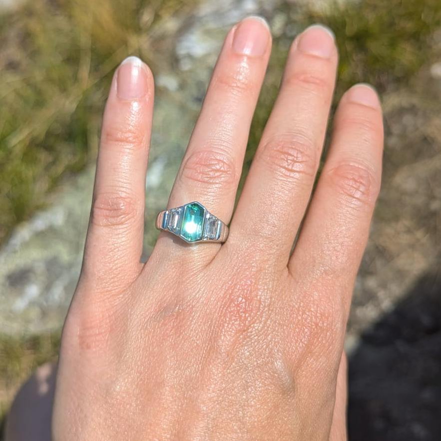 Ben, Aniko's rare tourmaline and white sapphires platinum engagement ring